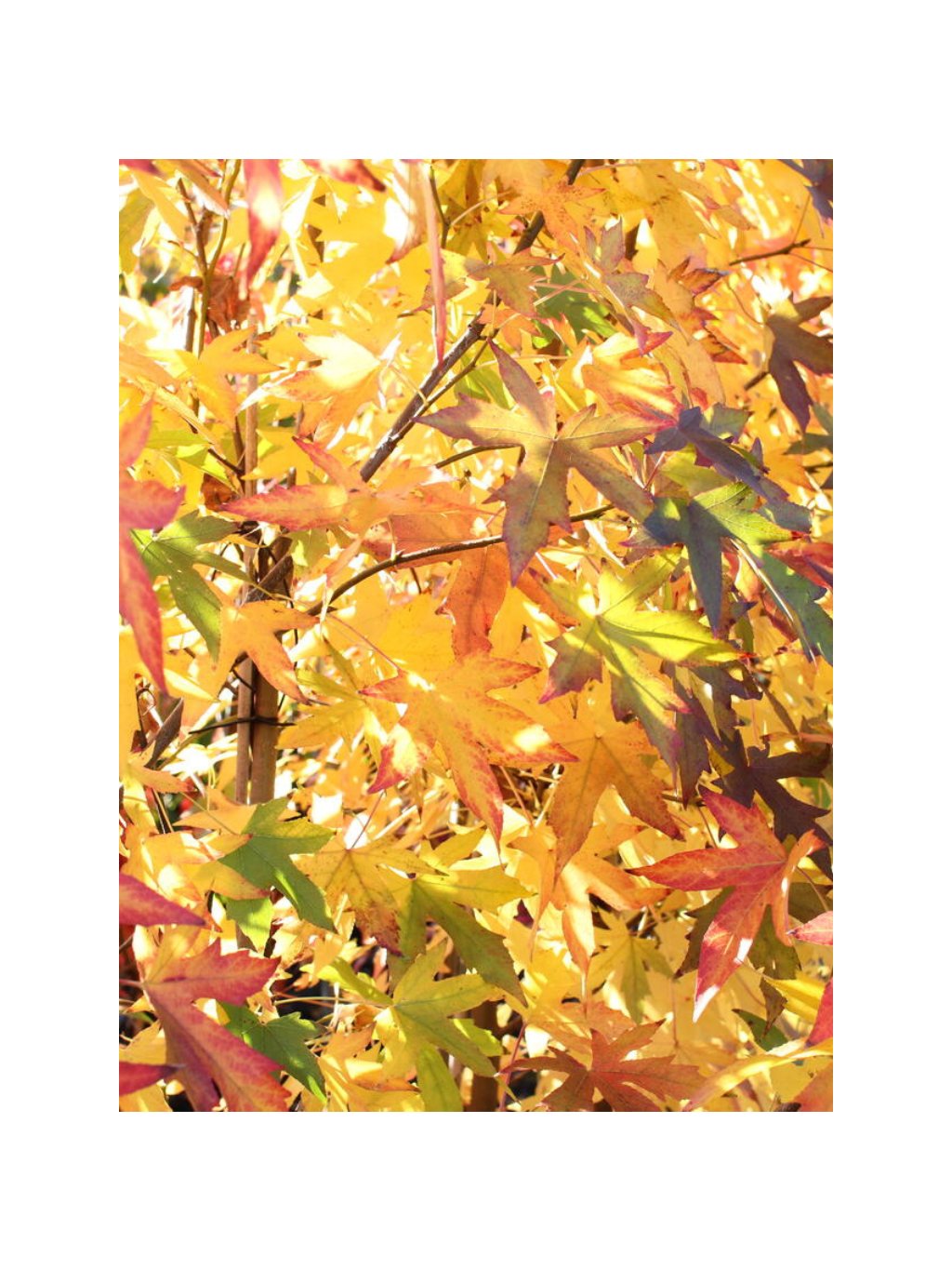 Ambroň západní 'Worplesdon' - dekorativní, nenáročný, odolný, opadavý strom. Dorůstá výšky 10–18 metrů s úzkou kuželovitou korunou. Zpočátku je jeho růst spíše úzký až sloupovitý. V průběhu let se koruna více rozšiřuje, a je polootevřená, široce pyramidální. Jeho listy jsou hluboce vykrajované a mají podobný tvar jako listy javoru, okraje jsou pilovité. Na podzim se zbarvují do ohromující palety barev, včetně zlaté, oranžové, červené a vínové, což z něj dělá výrazný prvek zahrady nebo parku. Tento kultivar je oblíbený díky spolehlivému podzimnímu vybarvení a snáší různé půdní podmínky, pokud má dostatek vláhy. Nenápadné, žlutozelené květy se mohou objevovat od března do května a po nich následují plodové tobolky, ty zůstávají na stromě viset i v průběhu zimních měsíců. Ambroň západní je původem ze severovýchodních částí Severní Ameriky a Střední Ameriky, kde roste jako středně velký opadavý strom. Jeho výška se pohybuje mezi 15 až 30 m a může mít kuželovitý tvar se širokou korunou. Listy Liquidambaru styraciflua jsou složeny z 3-7 laloků a svými různobarevnými odstíny se stávají okrasou zahrad nejen na jaře, kdy jsou zelené, ale zejména na podzim, kdy se jejich barvy mění. Často získávají odstíny oranžové, červené a fialové, což stromu dodává nádherný a výrazný vzhled, který si zamilují nejen zahradníci, ale i kolemjdoucí. Tato dřevina je velmi oblíbená v parcích a okrasných zahradách díky svým pestrobarevným listům na podzim. Jelikož má schopnost vyvinout takto krásné odstíny, je hojně využíván jako solitér nebo k oživení širších ploch ve městech. Existuje celá řada kultivarů, které se liší výškou, tvarem koruny, velikostí listů a intenzitou barevných změn na podzim. Ambroň západní je všestranná a nenáročná rostlina, která dokáže ozvláštnit a zpříjemnit jakoukoli zahradu. Není na pěstební podmínky příliš náročný. Nejlépe se mu daří na neutrálních až mírně kyselých, dostatečně vlhkých půdách, což může zahrnovat jak štěrkovité a písčité, tak i jílovité a bažinaté substráty. Pro růst vyžaduje spolehlivé zásobení vláhou. Pěstování: Liquidambar styraciflua není na pěstební podmínky příliš náročný. Nejlépe se mu daří na neutrálních až mírně kyselých, dostatečně vlhkých půdách, což může zahrnovat jak štěrkovité a písčité, tak i jílovité a bažinaté substráty. Pro růst vyžaduje spolehlivé zásobení vláhou. Ambroně rostou středně rychle, v dobře propustné, nevysychavé, živné, mírně kyselé půdě. Na zimu zajistíme, především u mladších jedinců, zimní kryt. Pokud chcete ambroň udržet v menším tvaru, řez se provádí na konci zimy.Doplňkové parametry