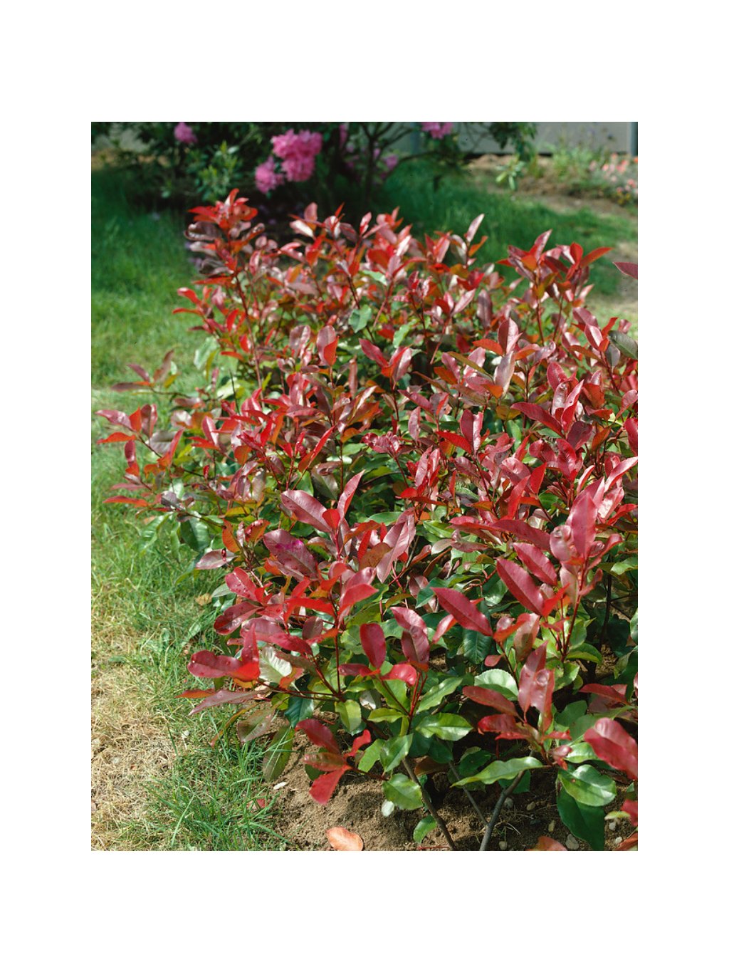 Photinia fraseri 'Red Robin' – oblíbený a atraktivní keř, známý svou krásnou červenou novou výhony a bohatým zeleným olistěním. Na jaře, kdy se objevují červené listy, poskytuje nádherný kontrast vůči tmavě zeleným starším listům. Postupem času se červené listy mění na sytě zelenou, což vytváří zajímavý barevný přechod po celé vegetační období. Keř dosahuje výšky 2–4 metry a šířky 2–3 metry a může být pěstován jako solitér nebo jako živý plot. V průběhu jara a léta se na rostlině objevují bílé květy, které mají příjemnou vůni a přitahují včely a motýly. V létě a na podzim se také objevují malé, červené plody. Pěstování: Photinia fraseri 'Red Robin' preferuje slunná až polostinná stanoviště a dobře propustnou, mírně kyselou až neutrální půdu. Je odolná vůči suchu, ale pro optimální růst potřebuje pravidelnou zálivku, zejména v suchých obdobích. Tato rostlina je plně mrazuvzdorná a dobře snáší naše klimatické podmínky. Je ideální pro výsadbu jako solitér, do živých plotů nebo jako dekorativní prvek v zahradách a parcích. Pro udržení kompaktního tvaru je doporučeno pravidelně ořezávat výhony, zejména po odkvětu.